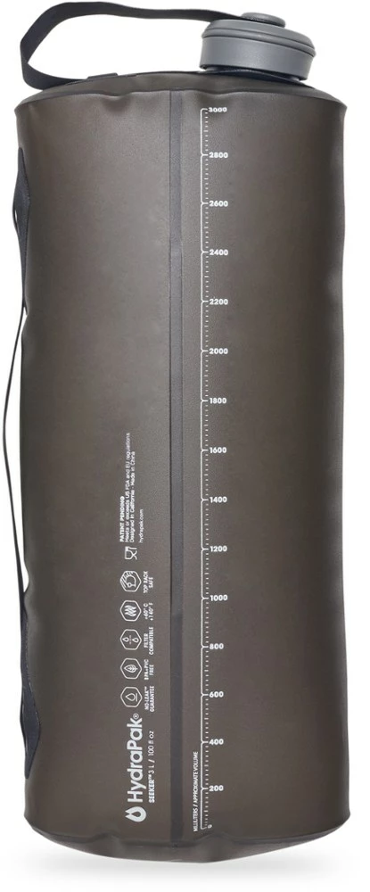 Built for long-haul excursions, the HydraPak 3L Seeker collapsible water container boasts a weather-resistant pour handle, 2 side lash points for hanging or pack attachment and a freezable design.