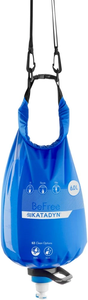 No pumping required! Just fill and hang the sleek, foldable Katadyn Gravity BeFree 6 L water filter and let gravity do the work. Its EZ-Clean Membraneâ„¢ filters water at a rate of up to 2 L per minute.