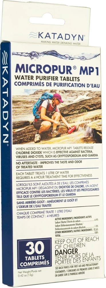 Purifying water couldn’t be easier. Simply drop a Katadyn Micropur tablet into a liter of water and let it sit for 4 hours, then drink with confidence—and no chemical aftertaste.