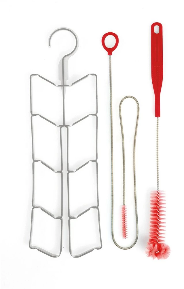 - Includes a reservoir cleaning brush, delivery system cleaning brush and drying rack